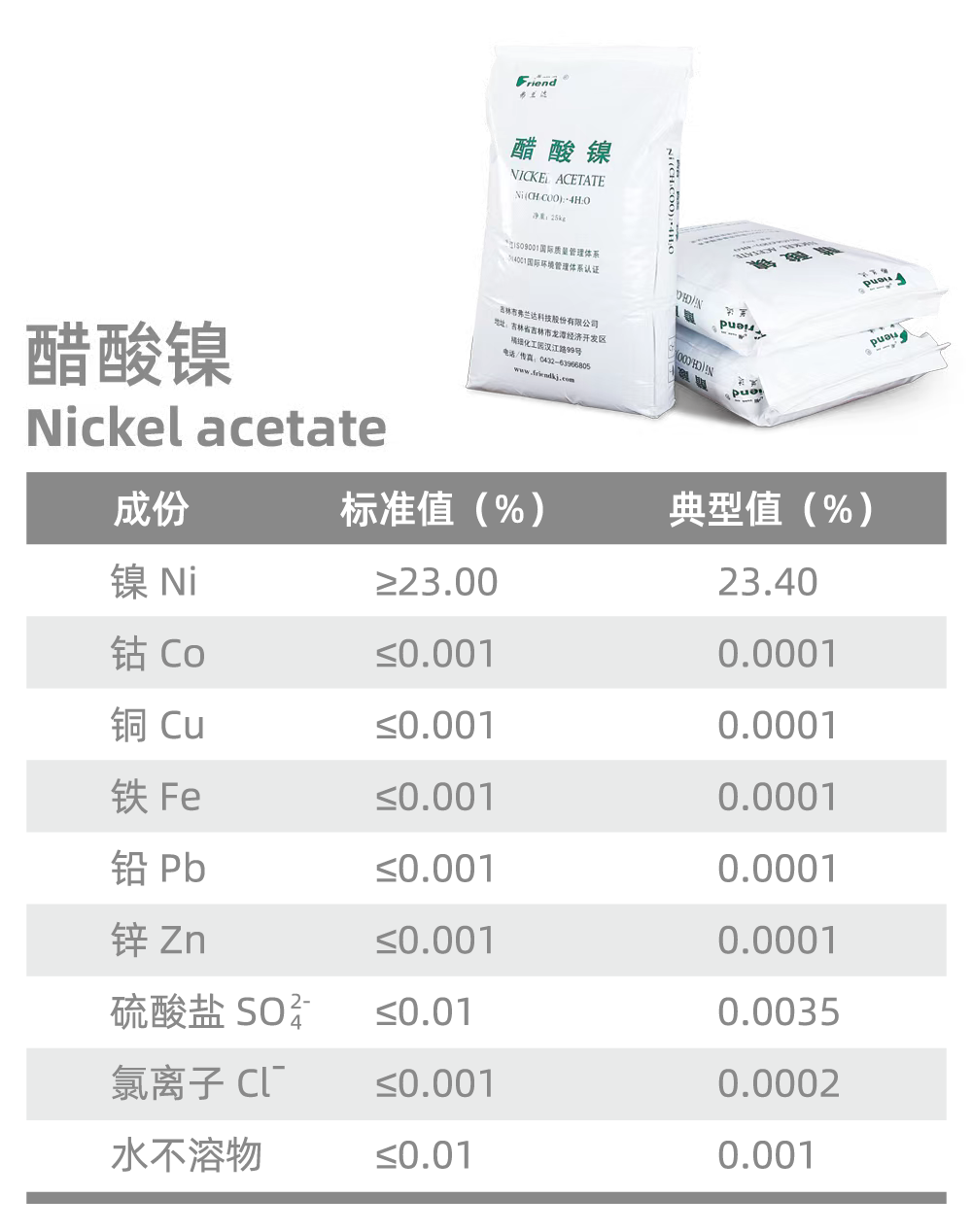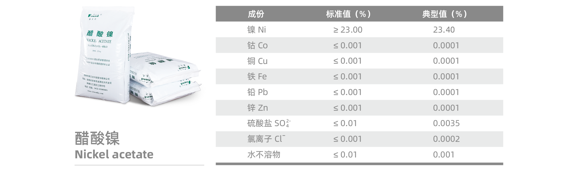 醋酸鎳(Nickel acetate) 分子式:C4H6O4Ni·4H2O 分子量:248.86 性 狀:綠色結(jié)晶性粉末,有醋酸氣味,遇水可溶解。 用 途:主要用于封孔劑、表面處理劑、電鍍、陽極氧化、金屬著色、催化劑和陶瓷色釉以及分析化學(xué)試劑等。 包 裝:塑編袋裝,每袋25公斤。 儲 運(yùn):運(yùn)輸過程中,防止雨淋、受熱、受潮。不宜與酸類物品混運(yùn)。貯存在通風(fēng)、陰涼、干燥的庫房內(nèi),防止雨淋、受潮。不宜與酸類物品混貯。